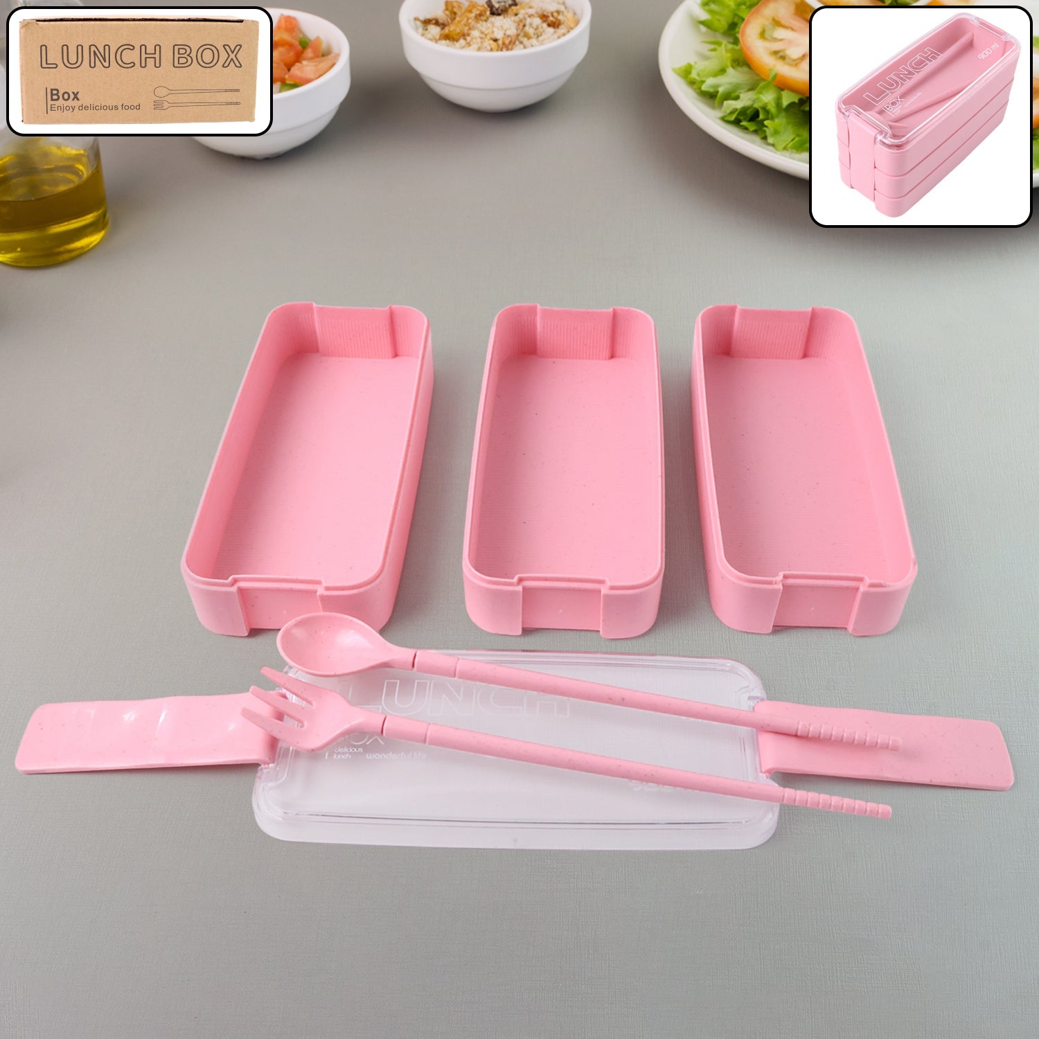 - Eco-Friendly 3-Layer Stackable Lunch Box Set with Cutlery Eco-Friendly 3-Layer Stackable Lunch Box Set with Cutlery