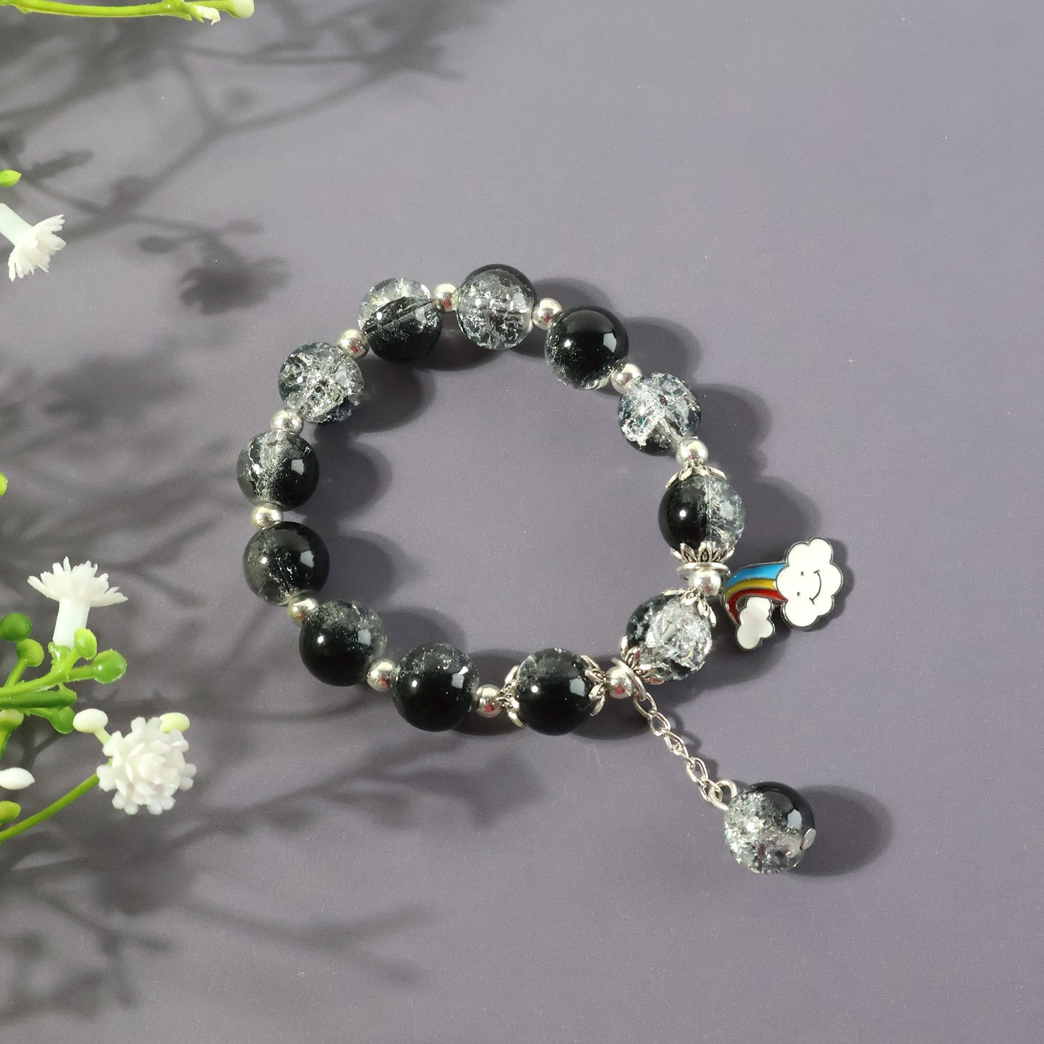 This beautifully crafted bracelet features a striking combination of glossy black beads and crackled crystal beads, creating a sophisticated contrast that elevates any look. The bracelet is fully stretchable, offering a comfortable fit for most wrist sizes without the hassle of clasps. A charming cloud-and-rainbow enamel pendant along with a delicate bead dangler adds a playful yet elegant touch, making it perfect for both casual and festive occasions. Designed to complement modern fashion trends, this accessory enhances your everyday style and also works wonderfully as a thoughtful gift. Its lightweight feel ensures long wear without discomfort, making it an ideal accessory for women and girls who love expressive jewelry.